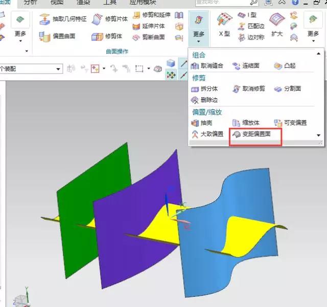 在曲面操作中點(diǎn)擊選項(xiàng)【更多】下拉菜單,找到【變距偏執(zhí)面】