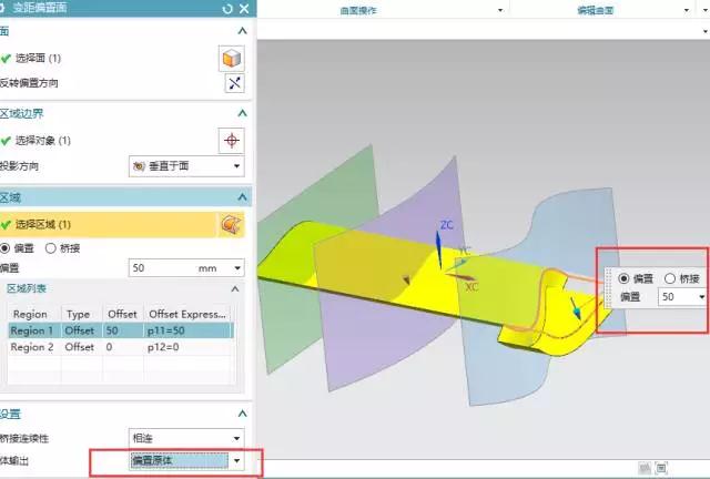 然后再區(qū)域列表中選擇需要偏執(zhí)的面,輸入偏執(zhí)距離,可輸入正負(fù),或者直接點(diǎn)擊黃色面上的箭頭直接輸入,體輸出選擇偏執(zhí)原體。