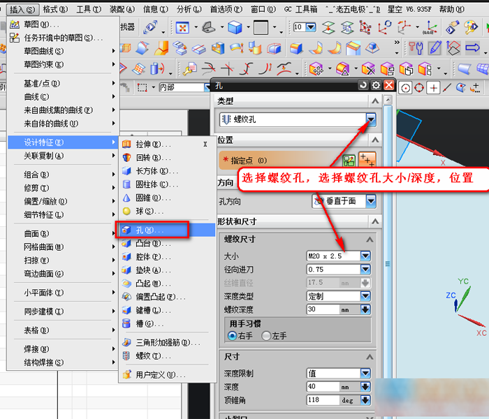 假如沒有的話,就需要我們自己手動創(chuàng)建。利用插入-設(shè)計特征-孔。創(chuàng)建螺紋孔。