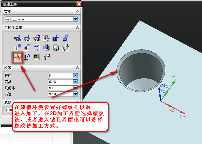 在2D加工界面選擇螺紋銑,或者在鉆孔界面也可以選擇。