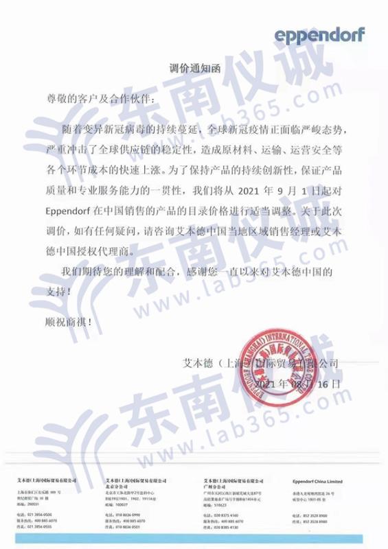 內(nèi)蒙儀誠近日接到eppendorf艾本德廠家調(diào)價通知。因受全球疫情影響,原材料、運輸、運營安全等各個環(huán)節(jié)成本快速上漲,艾本德將從2021年9月1日起,對產(chǎn)品目錄價格進(jìn)行適當(dāng)調(diào)整,具體通知如下:
