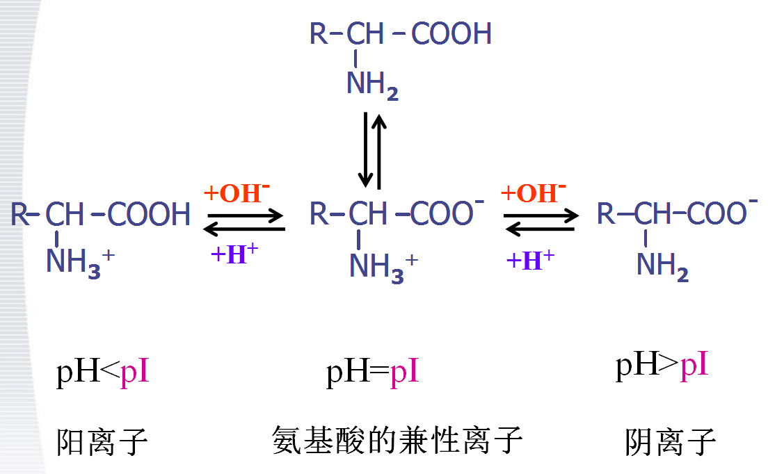 蛋白質(zhì)的等電點(diǎn)( isoelectric point, pI) 當(dāng)?shù)鞍踪|(zhì)溶液處于某一pH時(shí),蛋白質(zhì)解離成正、負(fù)離子的趨勢(shì)相等,即成為兼性離子,凈電荷為零,此時(shí)溶液的pH稱為蛋白質(zhì)的等電點(diǎn)。