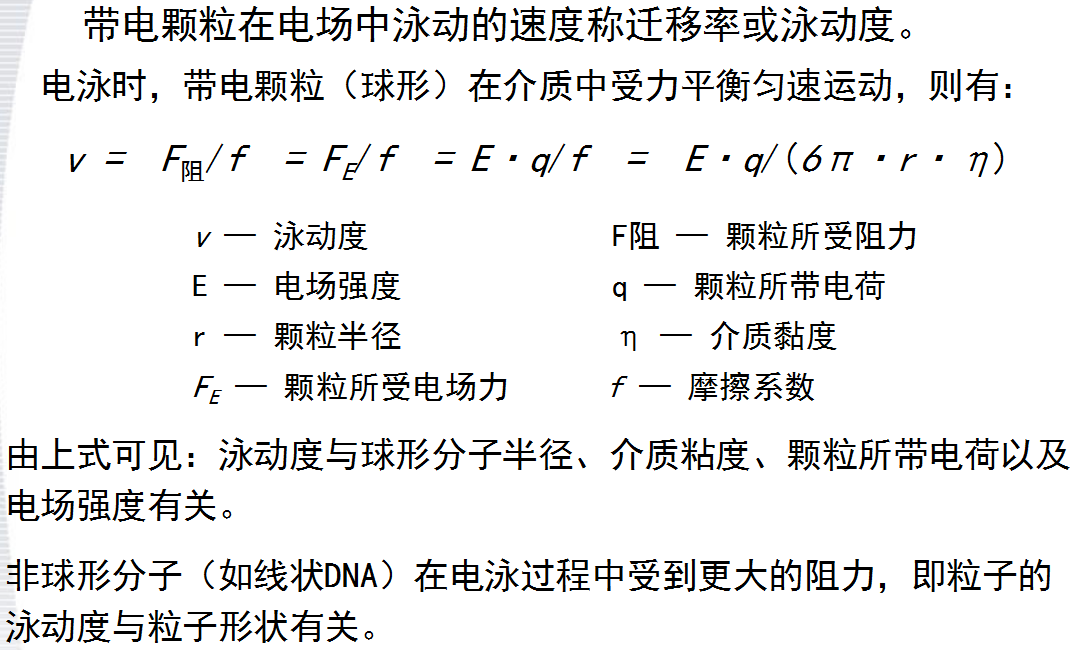 電泳是帶電顆粒在電場作用下,向著與其電荷相反的電極移動的現(xiàn)象。 在一定pH條件下,每一種分子都具有特定的電荷(種類和數(shù)量)、大小和形狀,在一定時間內(nèi)它們在相同電場中泳動速度不同,各自集中到特定的位置上而形成緊密的泳動帶。這就是帶電粒子可以用電泳技術(shù)進行分離、分析和鑒定的基本原理。